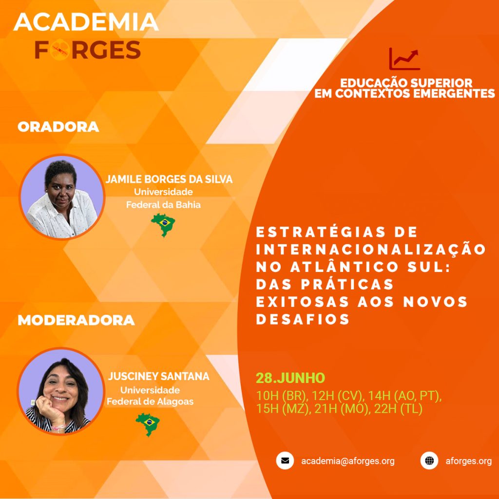A ACADEMIA FORGES apresenta, através do grupo de trabalho do eixo educação superior em contextos emergentes,no próximo dia 28 de junho, pelas 14h (hora em Portugal Continental), o webinar estratégias de internacionalização no atlântico sul: das práticas exitosas aos novos desafios, tendo como oradora convidada Jamile Borges da Silva (Universidade Federal da Bahia, Brasil). A […]