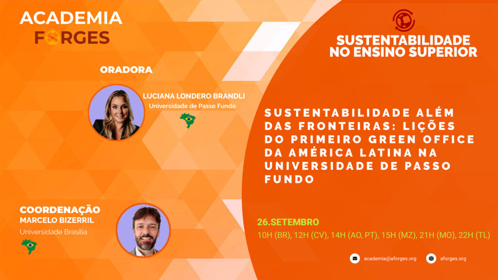 ACADEMIA FORGES promove próximo dia 26 de setembro, pelas 14h (hora em Portugal Continental), a sessão SUSTENTABILIDADE ALÉM DAS FRONTEIRAS: LIÇÕES DO PRIMEIRO GREEN OFFICE DA AMÉRICA LATINA NA UNIVERSIDADE DE PASSO FUNDO, com a participação de Luciana Londero Brandli (Universidade de Passo Fundo, Brasil). A coordenação está a cargo de Marcelo Bizerril (Universidade de […]